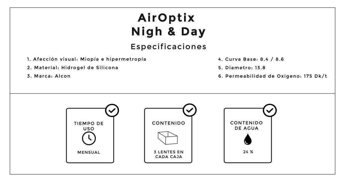 Air Optix Night & Day Aqua de Alcon son lentes de contacto de uso mensual diseñados para un uso extendido. Si tu optómetra lo avala, estos lentes de contacto pueden ser usados durante 30 días y 30 noches, lo que significa que puedes despertar cada mañana con una visión clara. Tus ojos necesitan un nivel de humectación natural que permita el uso de estos lentes de contacto, por lo que recomendamos consultar con tu contactólogo de confianza