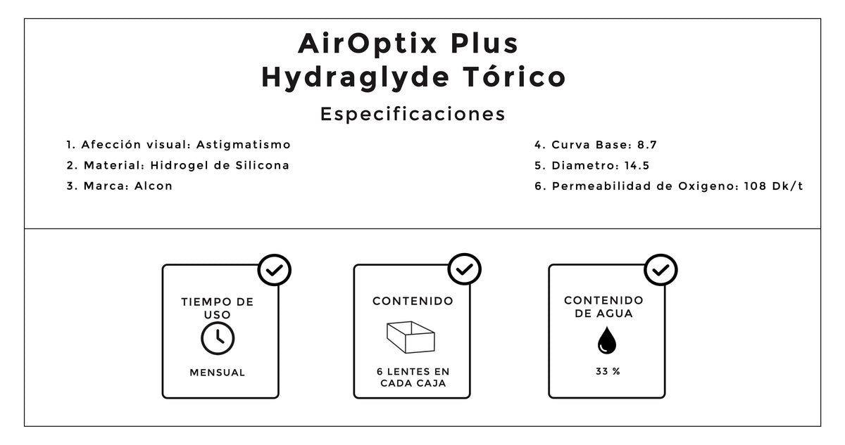 Los lentes de contacto Air Optix Plus HydraGlyde Astigmatismo para Astigmatismo de Alcon para uso mensual, han sido diseñados para aquellos usuarios que viven con astigmatismo y suelen sufrir de ojos secos.