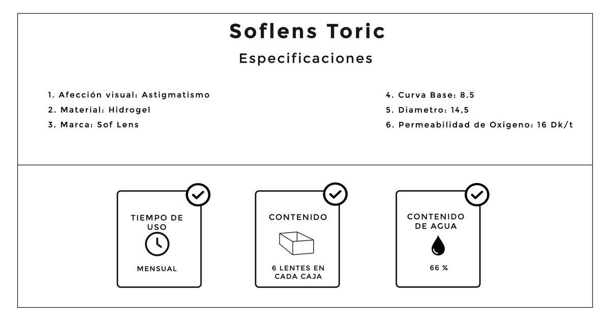 Los lentes de contacto SofLens Toric, del laboratorio Bausch & Lomb, están diseñados para ayudar a aquellas personas que viven con astigmatismo a disfrutar de una visión cristalina con un alto nivel de confort. Estos lentes de contacto son suaves y de uso mensual, están diseñados para adaptarse de forma segura a la forma del ojo, incluso con los casos más dramáticos de astigmatismo. Los lentes de contacto SofLens Toric se pueden usar hasta 30 días consecutivos, siempre que se realice una rutina de limpieza nocturna con una solución multipropósito.