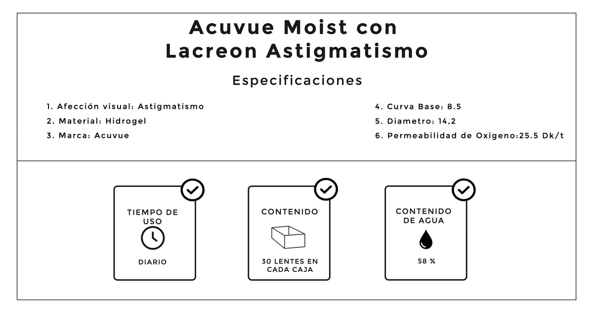 Los lentes de contacto 1-Day Acuvue® Moist para Astigmatismo del laboratorio Johnson & Johnson están diseñados para corregir el astigmatismo y ofrecer la comodidad de un lente desechable de uso diario. Tus ojos permanecerán húmedos, frescos y cómodos con este lente de contacto tórico diaria, disfrutarás de una visión nítida y clara durante todo el día. La tecnología LACREON garantiza que la humedad permanezca dentro del lente, evitando así fricción con el ojo y mayor incomodidad.