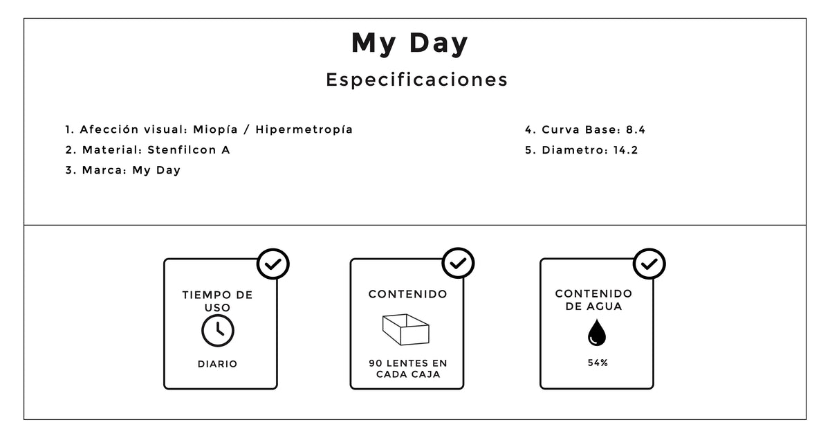 Los lentes de contacto MyDay 90 unidades son una opción de reemplazo diario de lentes de contacto suaves y cómodos. Estos lentes están hechos con material de silicona hidrogel que proporciona una excelente transparencia y oxigenación para los ojos. Son resistentes al desgaste y proporcionan una visión clara y nítida durante todo el día. Su contenido de agua es del 54%. Ten en cuenta, estos lentes de contacto son ideales para miopía e hipermetropía.